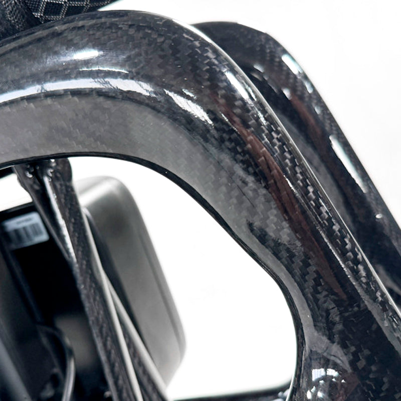 Su chasis de carbono con suspensión en las ruedas delanteras está diseñado para circular en superficies irregulares, ofreciendo unas características únicas de absorción de impactos con una experiencia de conducción suave y confortable.