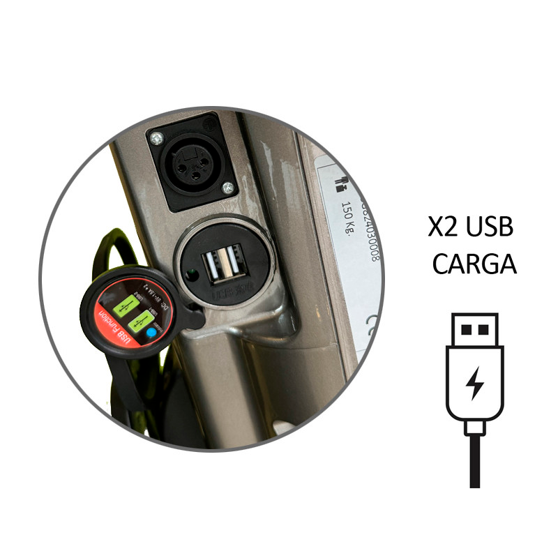 Siempre conectado mientras se desplaza con nuestro innovador scooter equipado con 2 puntos de carga USB en el mástil. Este modelo no solo le lleva a donde necesita, sino que también te asegura que sus dispositivos estén siempre listos para usar.