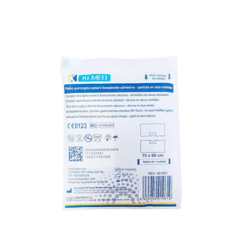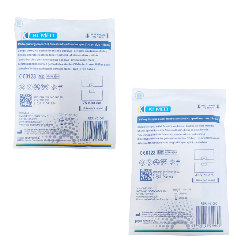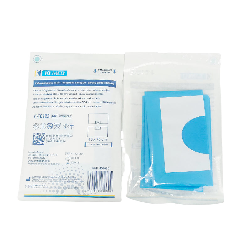 Los paños quirúrgicos estériles fenestrados adhesivos central partido en dos mitades (también conocidos como drapes divididos o paños partidos) son un tipo especial de campo quirúrgico diseñado para procedimientos que requieren mayor ajuste y versatilidad, especialmente en zonas anatómicas de difícil acceso o en cirugías donde se necesita exponer áreas específicas de manera controlada.