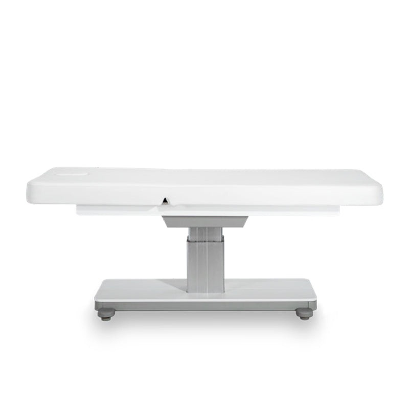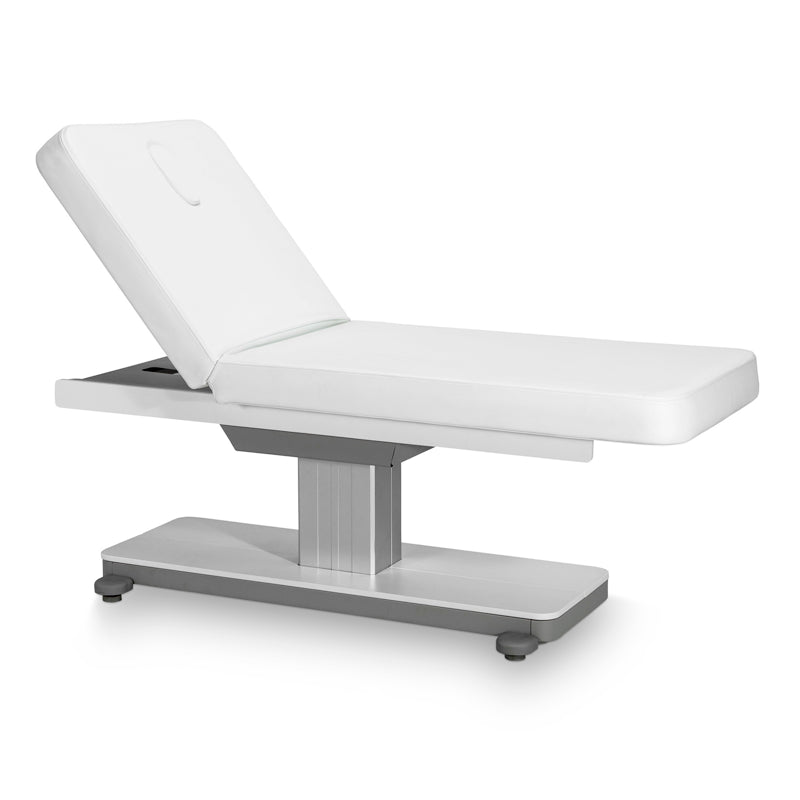 Camilla equipada con un motor para regular la altura. Respaldo regulable manual. Base y embellecedores laterales de madera (color blanco o color roble). Tapizado en PU, color blanco o crema. Portarrollos incluido.