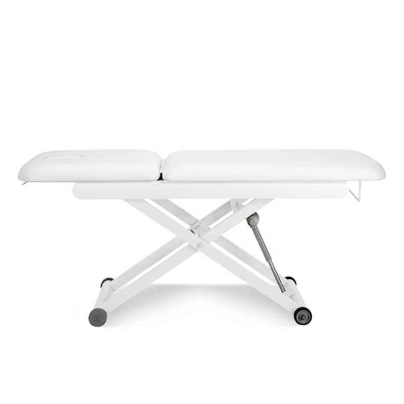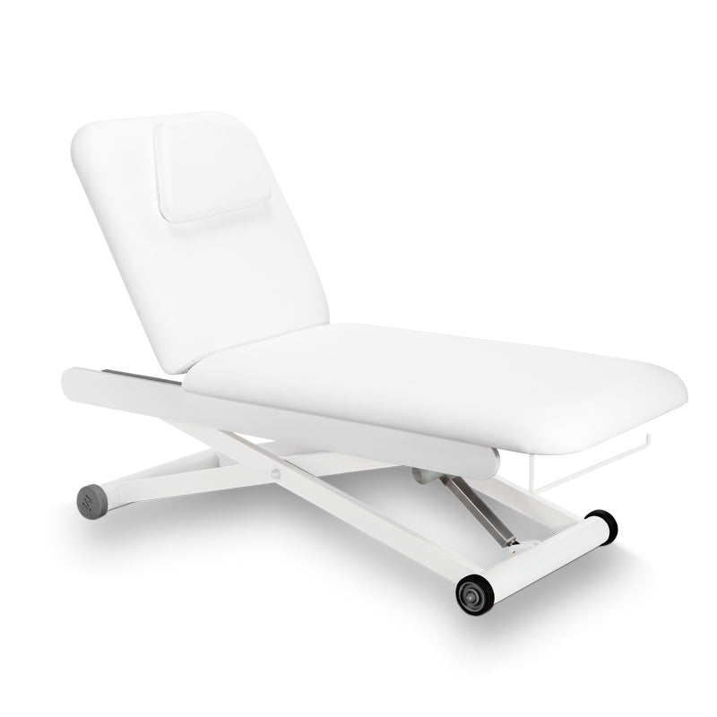Camilla muy robusta y estable, equipada con un motor para regular la altura y dos ruedas para su desplazamiento. Tapizado en PU, color blanco o crema. Cojín extraíble. Portarrollos incluido.