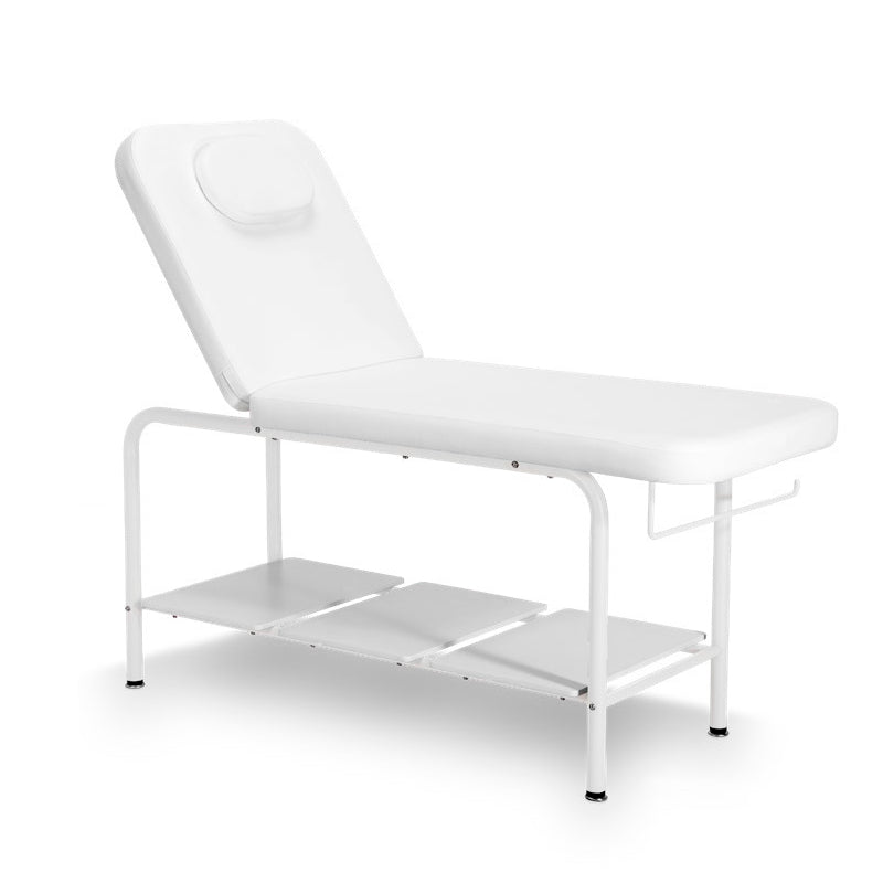 Camilla con estructura metálica color blanco y altura fija. Respaldo regulable mediante pistón de gas. Cojín extraíble. Portarrollos incluido. Tapizado en PU. Opción tapizado blanco con bandeja inferior blanca o tapizado crema con bandeja inferior de madera roble.