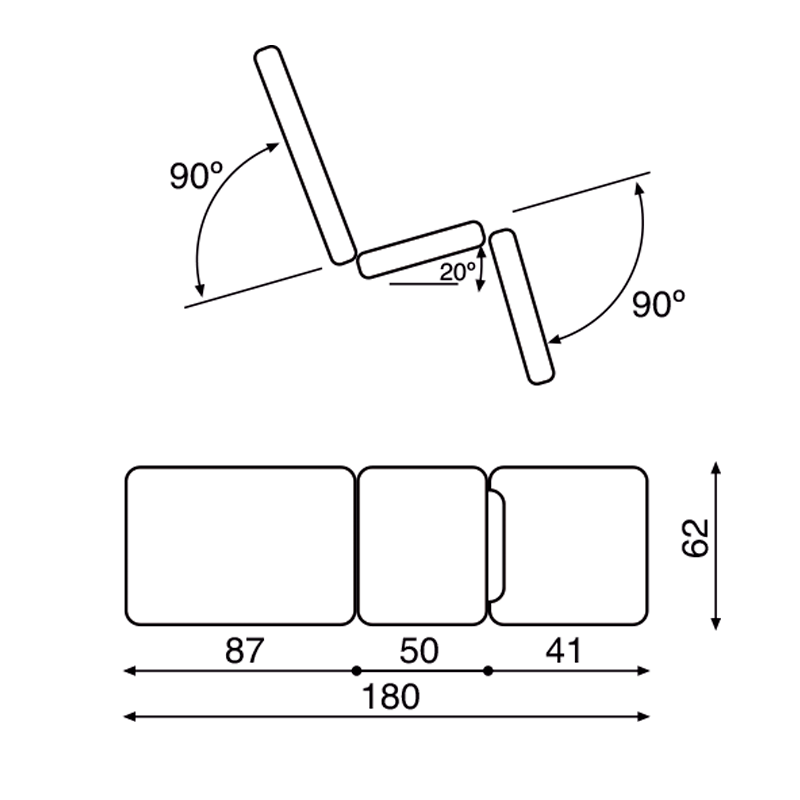 - Piecero abatible hasta posición horizontal mediante resorte a gas 90o •Asiento (soporte de pelvis) con trendelemburg eléctrico (20o respecto a la horizontal)