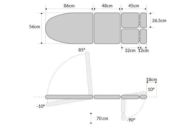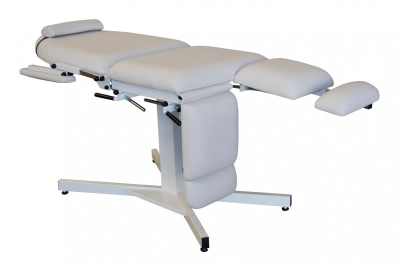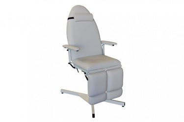 Sillón de podología de altura fija con perneras extensibles, reposacabezas regulable y brazos abatibles.