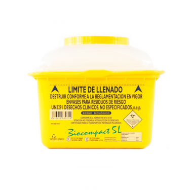 Recipiente de plástico, de color amarillo, con cuatro depresiones circulares transversales y dos planos enfrentados longitudinales que proporcionan rigidez y facilitan su manipulación. Presenta en altorrelieve grabadas las instrucciones de uso, la marca de llenado máximo y la indicación de biopeligro.