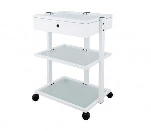 Práctico carrito de estructura metálica en color blanco con un cajón con llave y 3 amplios estantes de cristal para la colocación de instrumental. Total movilidad gracias a sus 4 ruedas.
