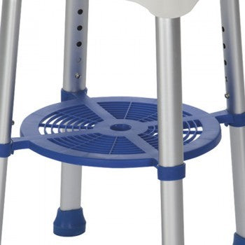 Taburete inoxidable con asiento giratorio para facilitar la movilidad. Patas de aluminio de altura regulable. Incorpora una práctica repisa para poder dejar esponjas, jabones, incluso el telefono de la ducha. Desmontable sin necesidad de herramientas.