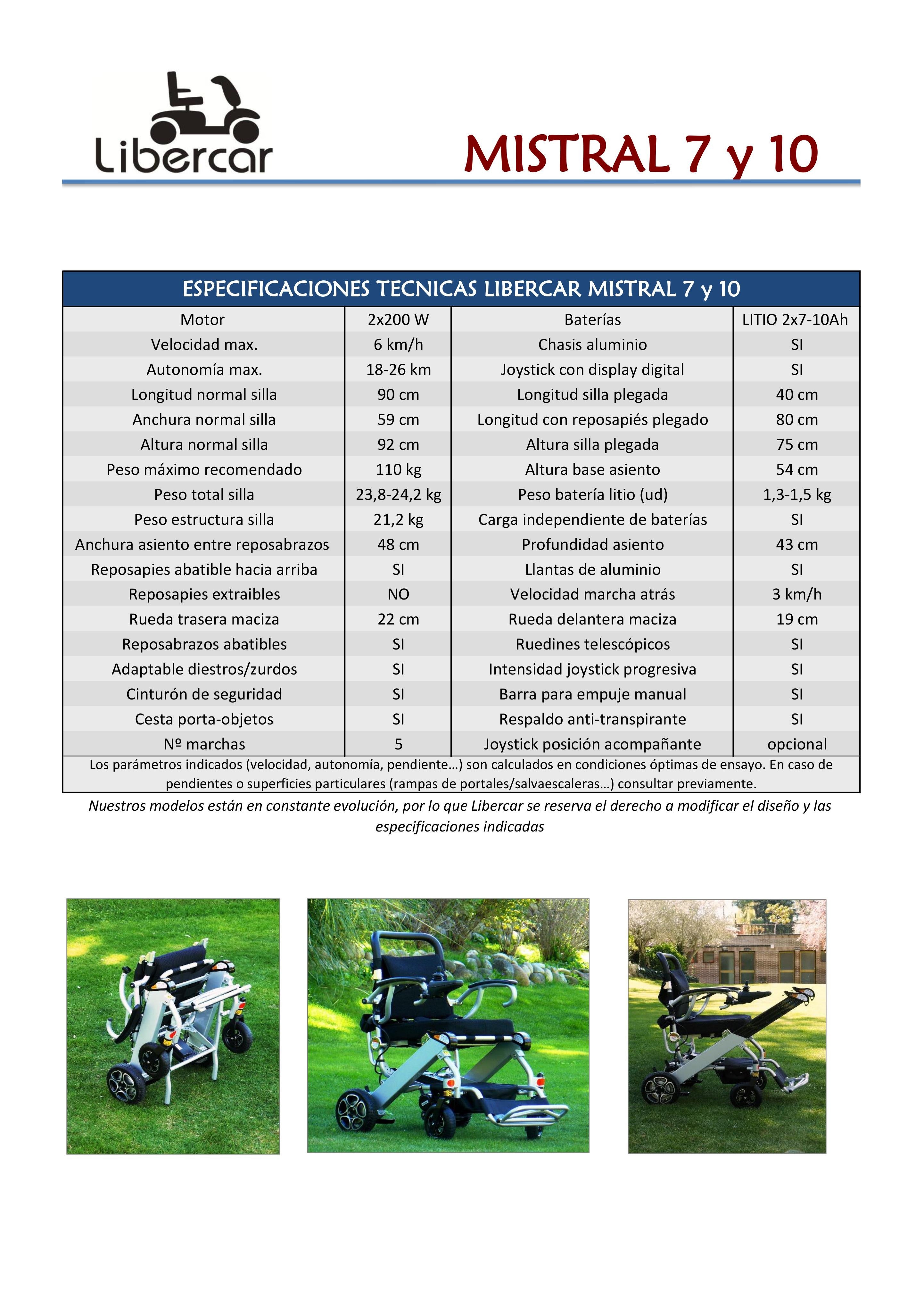 Especificaciones técnicas de la silla de ruedas eléctrica plegable Libercar Mistral: