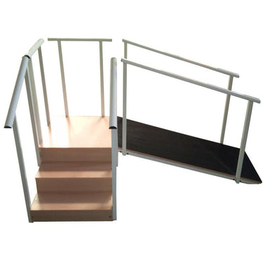 Descripción Escalera de tres peldaños para rehabilitación con rampa (Ref. FM-069-3)