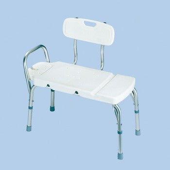 Silla de aluminio, regulable en altura de 46 a 57 cm. Se colocan dos patas dentro y dos fuera, así tendremos una silla dentro de la bañera y otra fuera. La transferencia al entrar y salir de la bañera es así más cómoda y segura. El banco de plástico tiene orificios de drenaje. La asidera reposabrazo, colocada en la parte interior del banco ofrece una ayuda adicional. Su diseño permite tener una silla dentro y otra fuera de la bañera.