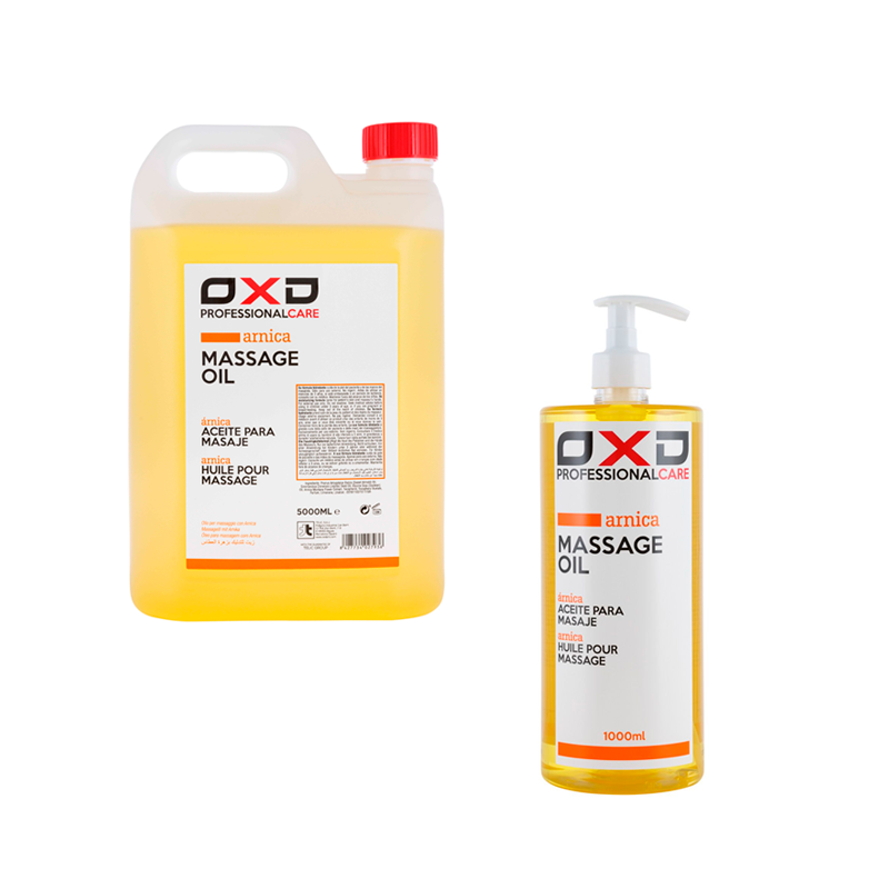 Aceite para masaje profesional con árnica OXD, con base de almendras y enriquecido con vitamina E, beneficioso para combatir la hinchazón y flacidez de la piel, así como para relajar la musculatura.