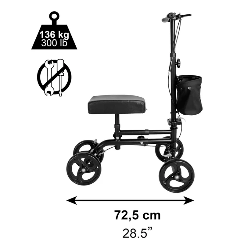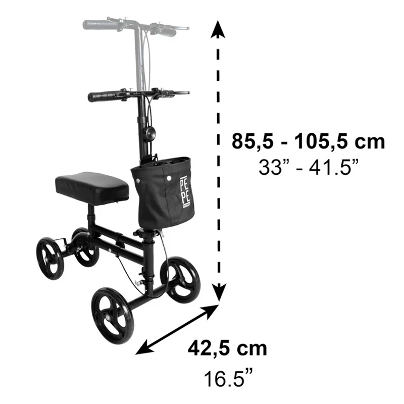 REGULABLE EN ALTURA: el andador puede regularse en altura (85,5 - 106 cm) así como el apoyo acolchado de rodilla (43 - 53 cm), lo que permite adaptarse a las necesidades del usuario. Además, es fácil de transportar y almacenar gracias a su sistema de plegado.