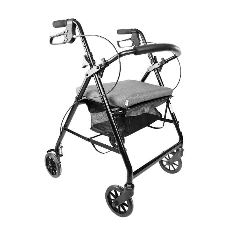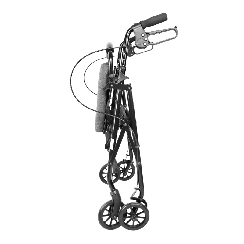 Se pliega fácilmente para guardarlo o transportarlo. Además, el andador tiene un sistema de freno por cable que se acciona al apretar las manetas e incorpora a su vez un freno de estacionamiento que hace que el andador no se mueva cuando se utiliza el asiento.