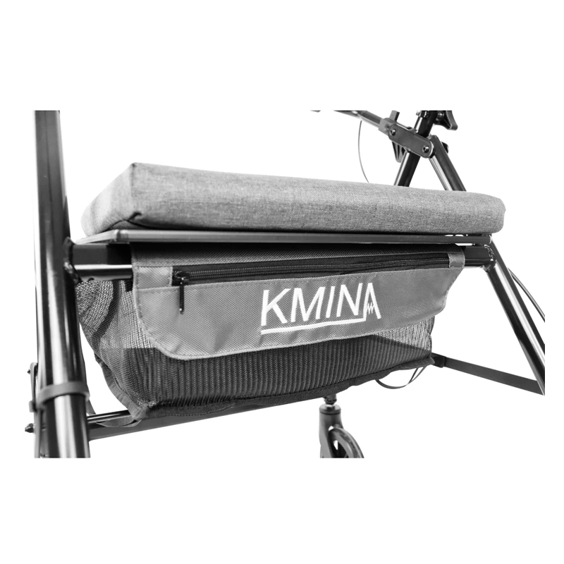 El asiento se levanta fácilmente para acceder a la cesta que nos permite guardar objetos. La cesta es de tela, lo que hace que el andador sea más ligero. Incluye, además, un bolsillo exterior con cremallera. Carga máxima de la cesta: 5 kg.