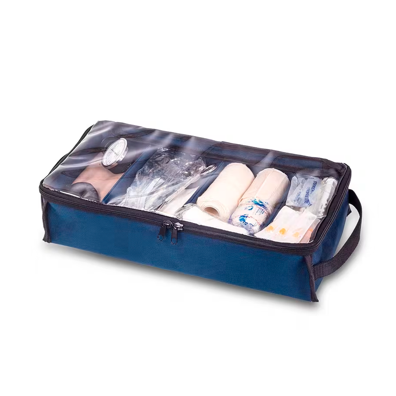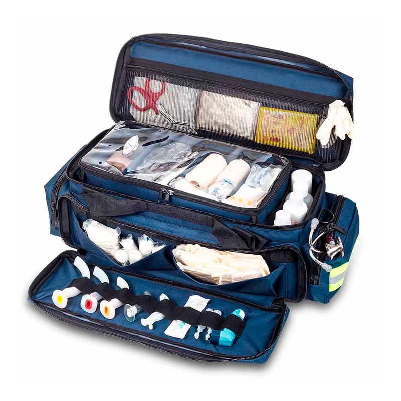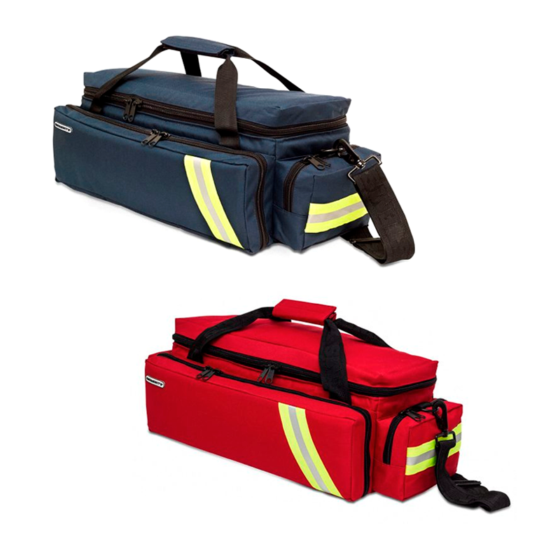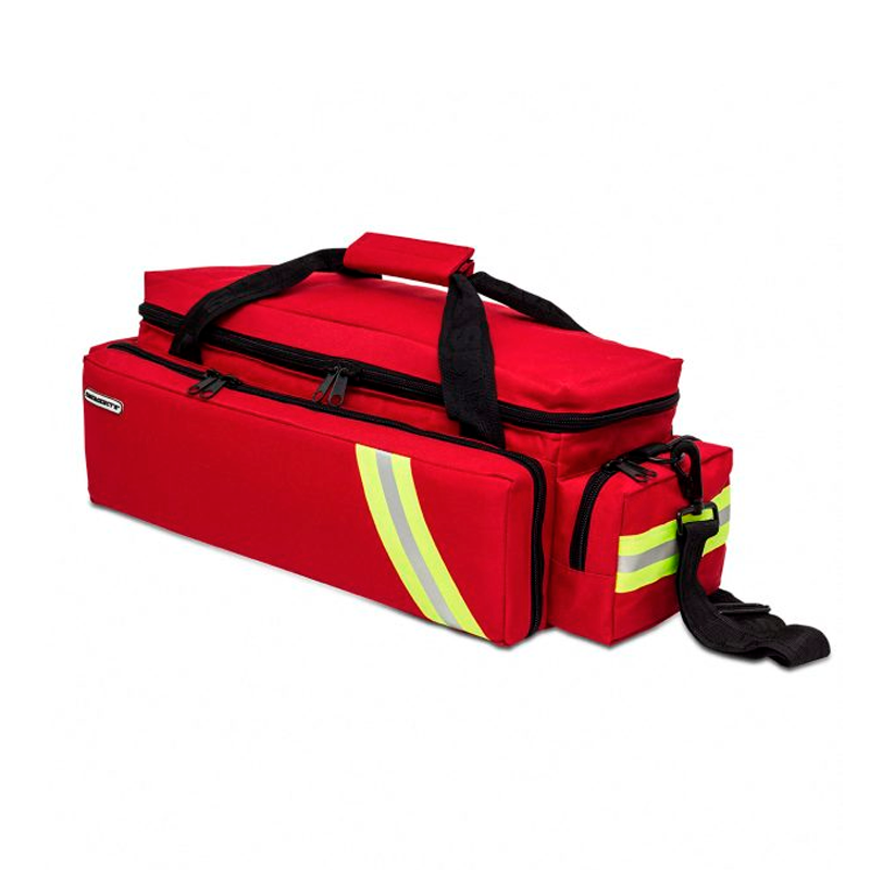 Bolsa de emergencias acolchada diseñada para alojar el material sanitario vinculado a la oxigenoterapia, subdividida en su interior a dos alturas: bandeja superior extraíble con divisores ajustables, parte inferior con tres separadores, diseñada para alojar la botella de oxígeno y bolsillo de rejilla en la solapa. Cuenta también con tres bolsillos externos, dos de ellos diáfanos y uno frontal sub dividido en su interior con bolsillos adicionales y gomas elásticas.
