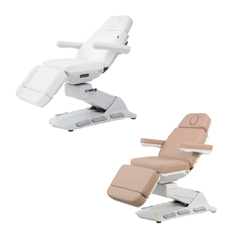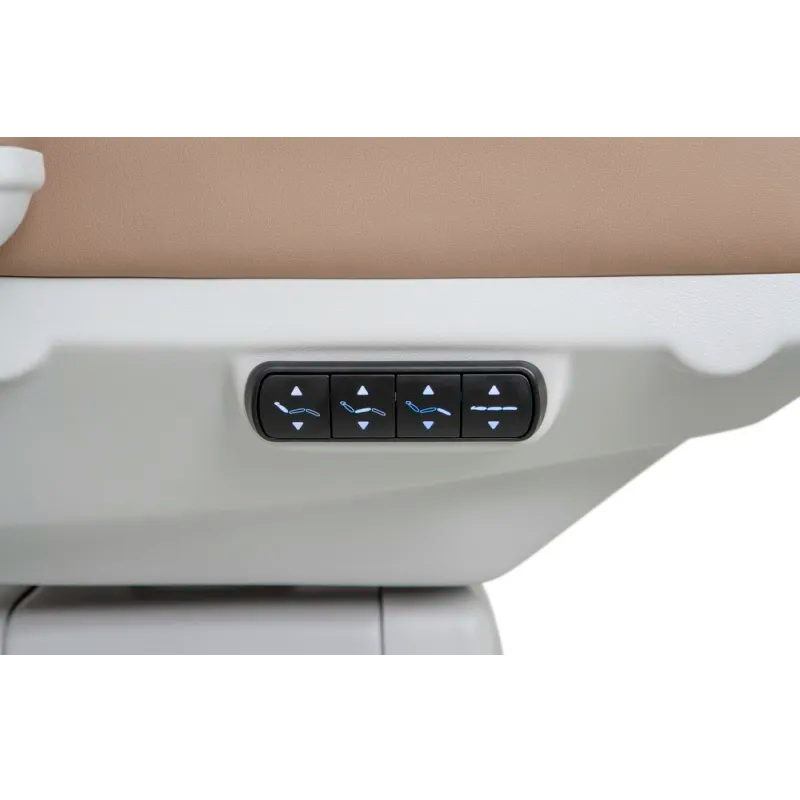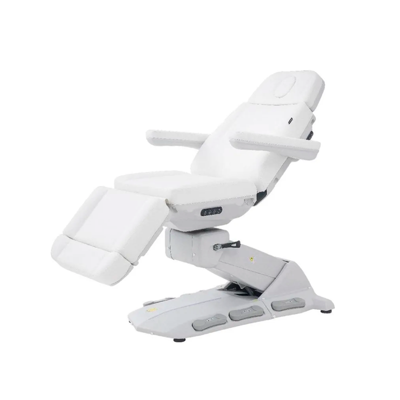 Equipada con 4 motores que permiten regular la altura, el respaldo, el asiento y el reposapiés. Incorpora giro de 110°, reposabrazos abatibles, calefacción con doble nivel de temperatura y sistema de memoria de posiciones. Tapizado en PU blanco de alta calidad, resistente y fácil de limpiar.