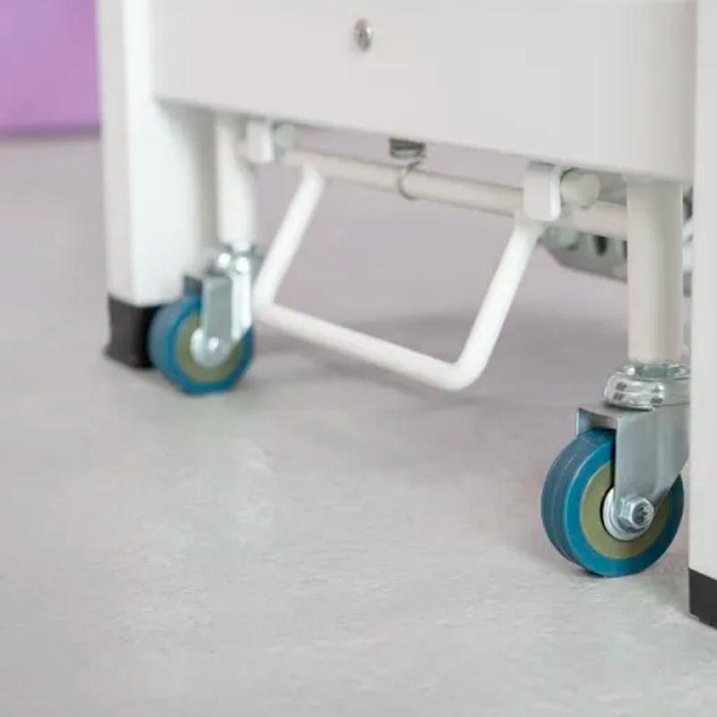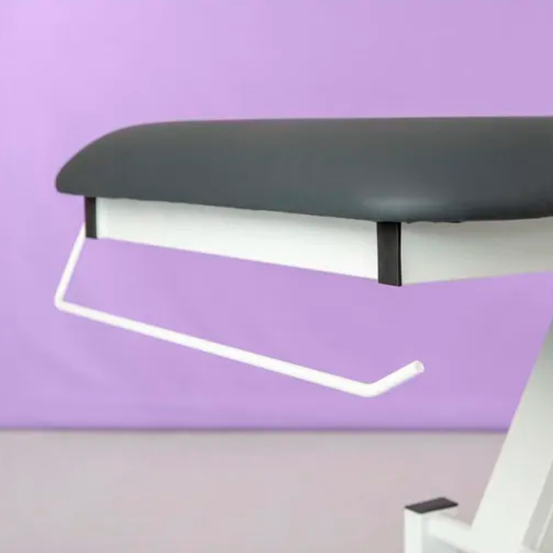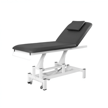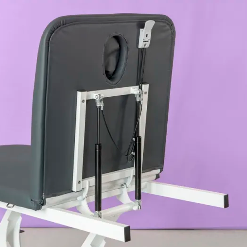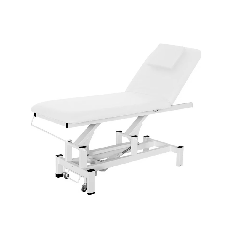 Equipada con 1 motor que permite regular la altura mediante mando de mano. Respaldo regulable mediante pistón de gas. Cojín reposacabezas extraíble con agujero facial. Ruedas escamoteables en un extremo de la camilla que facilitan su desplazamiento. En blanco y gris disponible. Portarrollos incluido.