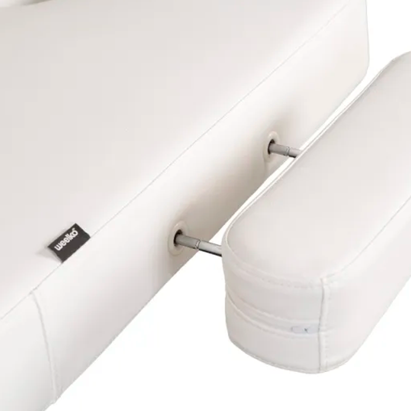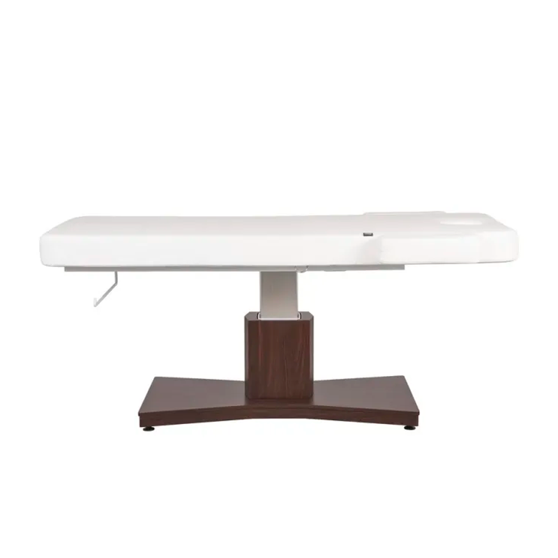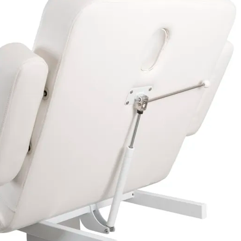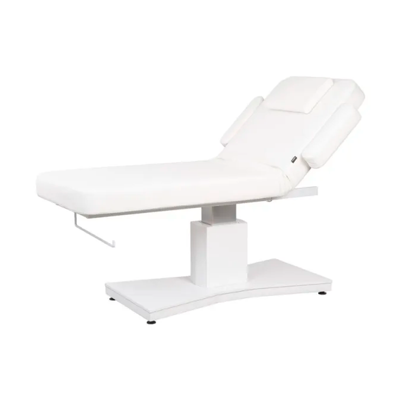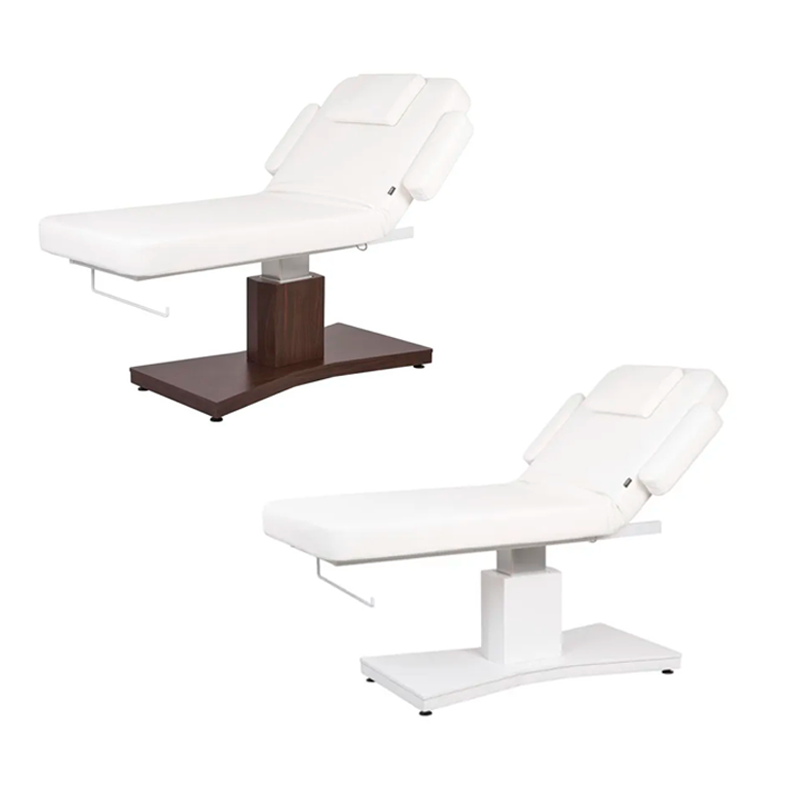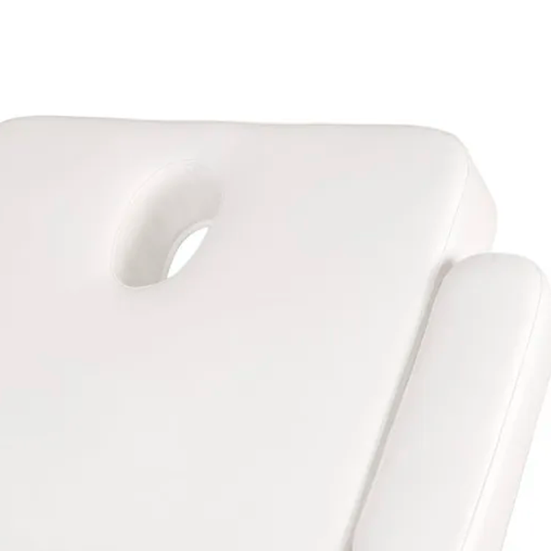 Un motor regula la altura con precisión, asimismo el respaldo se ajusta manualmente mediante pistón de gas. Incluye cojín cervical con agujero facial, reposabrazos extraíbles y portarollos incluido de serie, ofreciendo ergonomía y funcionalidad premium para spas y centros de belleza.