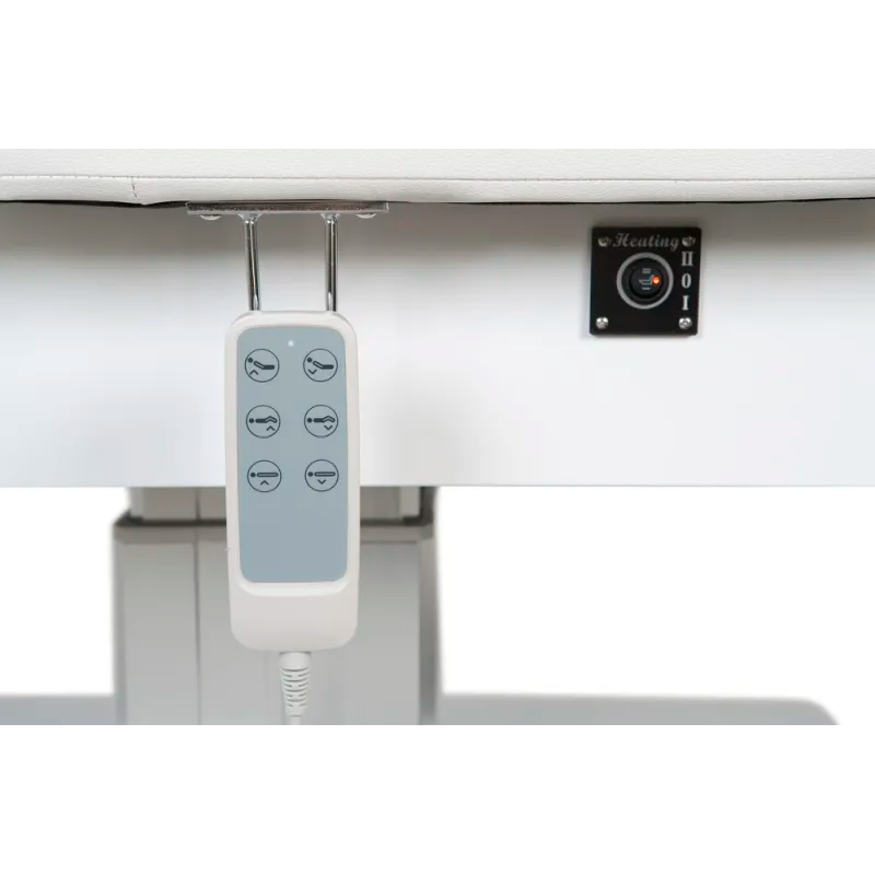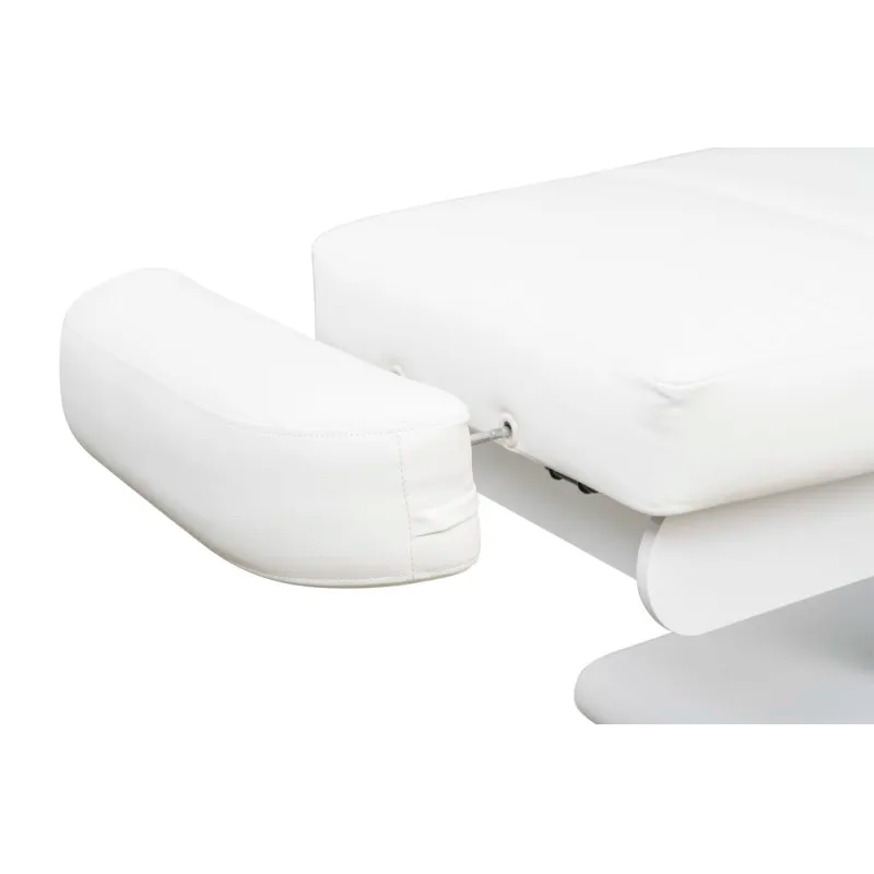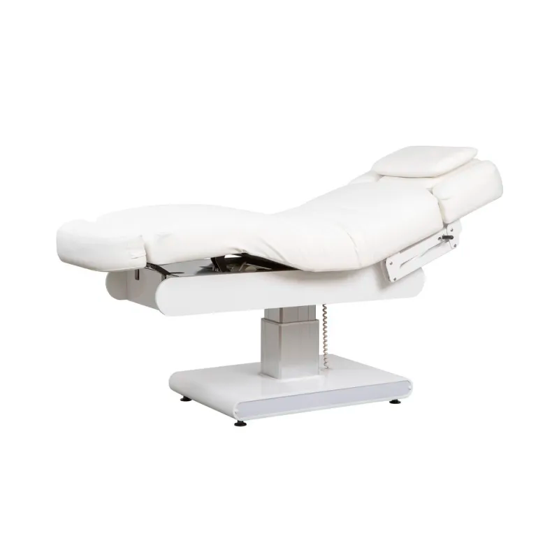 Más de 10 cm de acolchado ultra confortable tapizado en PU beige de alta calidad. Colchón de una única pieza con 3 secciones. Reposabrazos ajustables y cabezal con agujero facial. La base incluye un sistema de iluminación LED de colores intercambiables que puede adaptarse a cada centro.
