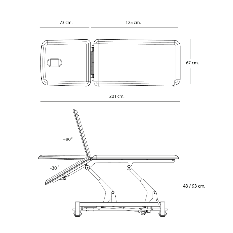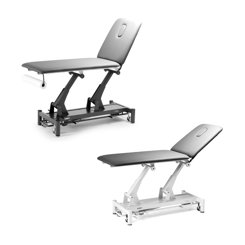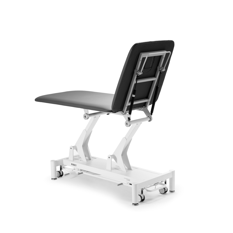 Estructura modular de dos cuerpos independientes que facilita ajustes precisos del respaldo y la zona de piernas, permitiendo posicionamientos ergonómicos adaptados a cada tipo de tratamiento.