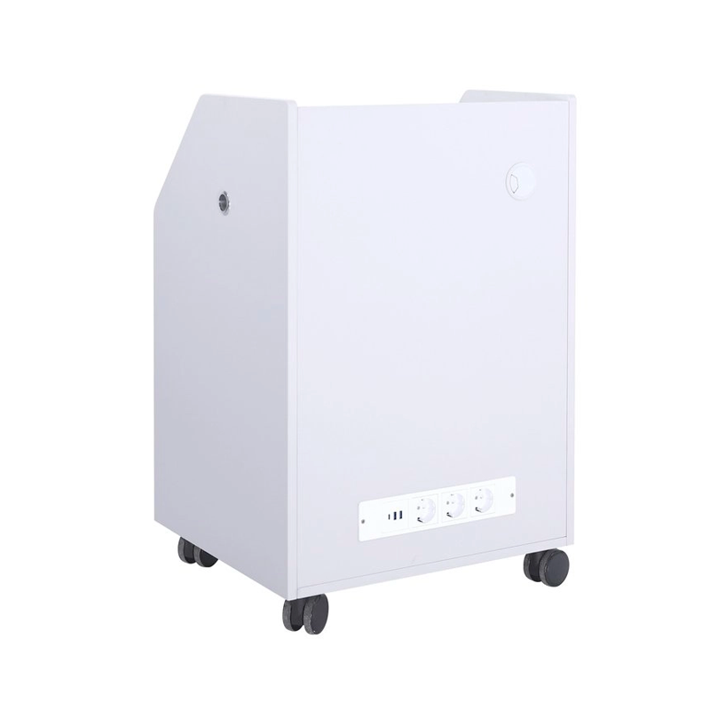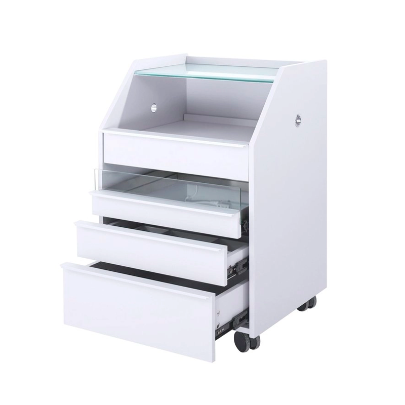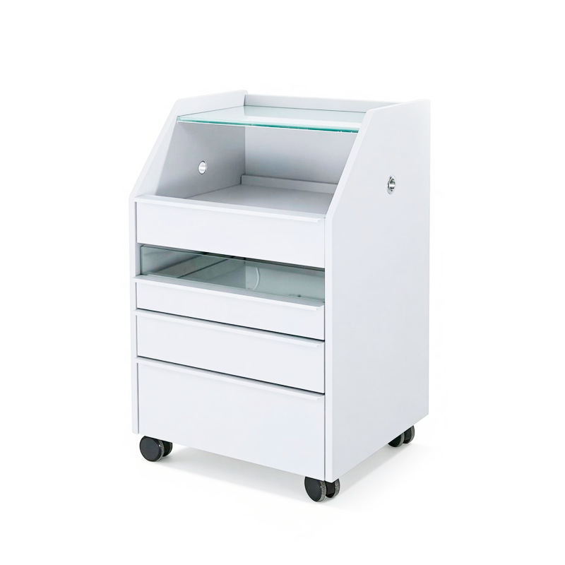 - La altura del alojamiento central permite colocar equipos esenciales, como un torno de uñas con absorbedor y su bandeja extraíble posibilita el ajuste de la distancia para la máxima precisión de trabajo.