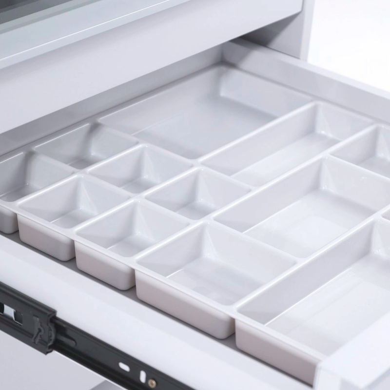 El organizador interno garantiza un acceso rápido a los accesorios esenciales y aumenta la comodidad durante los tratamientos. También dispone de alojamiento central con bandeja extraíble y un cajón dotado de luz UV, para la esterilización de instrumentos.