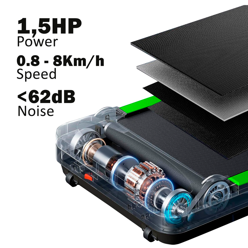 MOTOR ECO-DE®: Ultra silencioso de 1 CV ( menos de 68 dB) , con una potencia de 750 w, permite regular electrónicamente la velocidad desde 0.8 kms/h hasta 8 Kms/h en intervalos de 0.1 Kms/h.