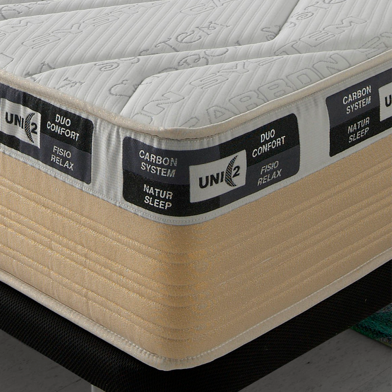 NÚCLEO: 22cm de ELIOCEL/PUR 25kg. CARA 1 : Acolchado con tejido STRECH Fibra de Carbono. 3 cms de viscoelástica: + 1,5 cm ViscoGEL. + 1,5 cm Soft S.S. CARA 2: Acolchado con tejido 3D air. + Fibra Ignifuga (Normativa UNE 23727). ALTURA ACABADO: 26/28 cm (+-1)