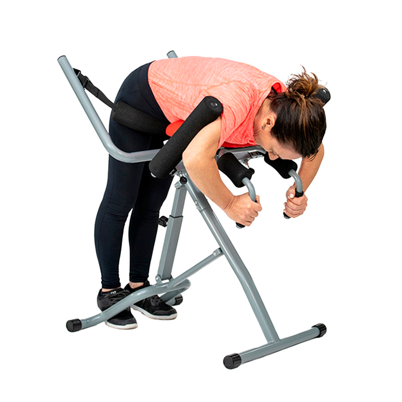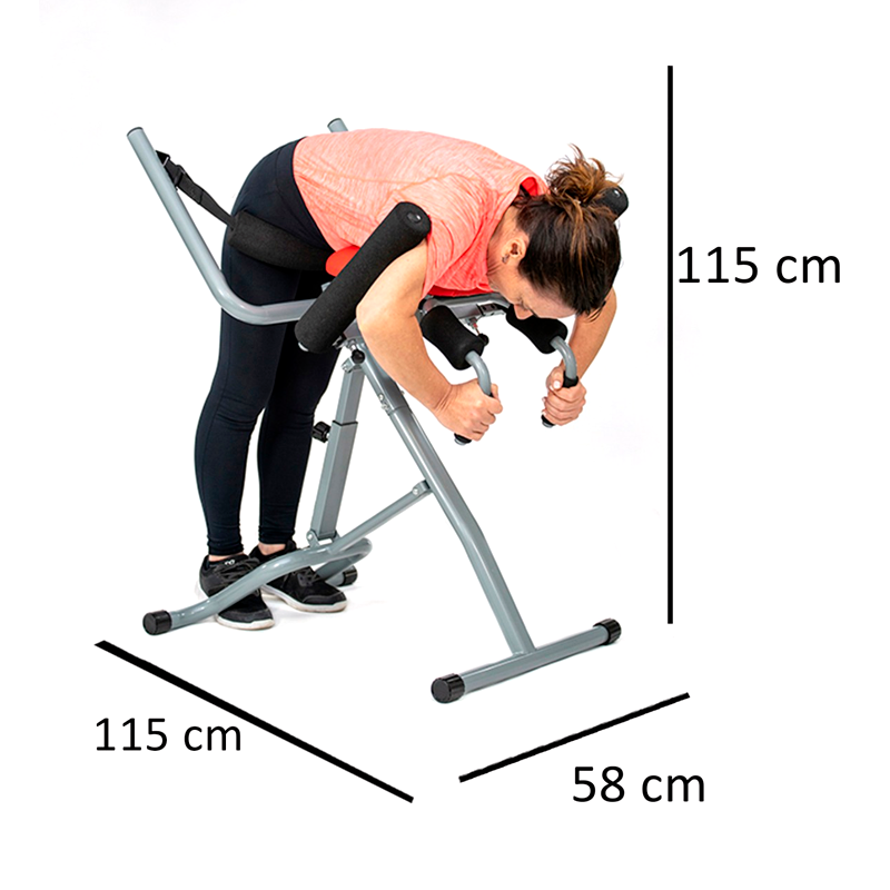 La barra acolchada abdominal, situada justo por debajo de la cintura, hace de retenedor mientras los soportes que quedan por detrás de los brazos, ayudándose del propio peso del usuario al inclinarse hacia delante, producen un estiramiento suave pero perceptible en la columna vertebral y los isquiotibiales.