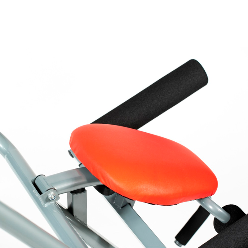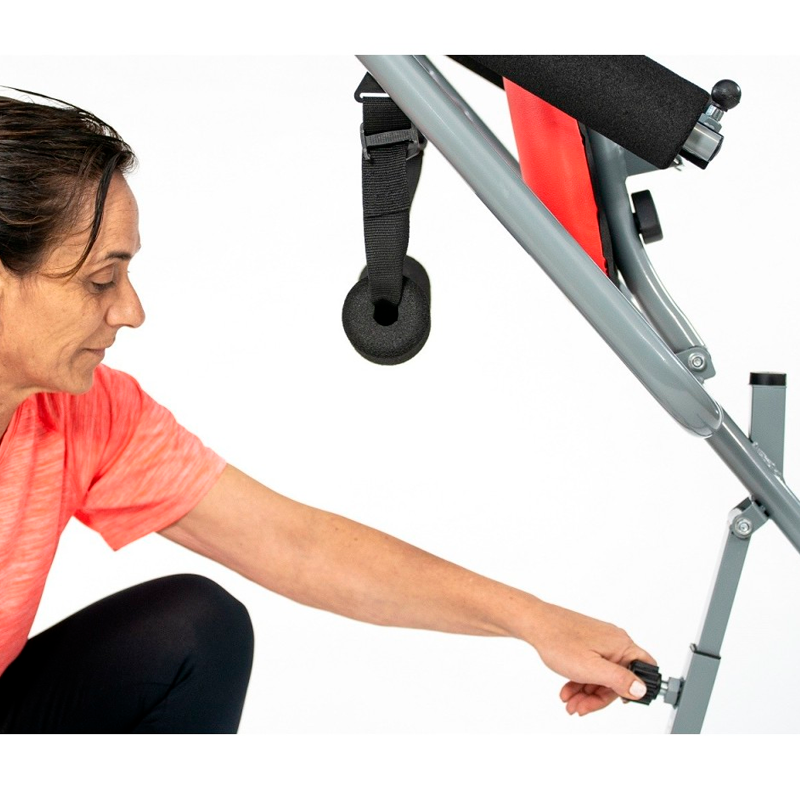 El movimiento de inclinación debe realizarse de forma suave y progresiva y, si es necesario, hacer los ajustes pertinentes tanto en la barra abdominal como en la altura del descompresor y la apertura de los soportes para los brazos, hasta encontrar una posición cómoda que permita al usuario mantener el estiramiento durante 2 o 3 minutos.
