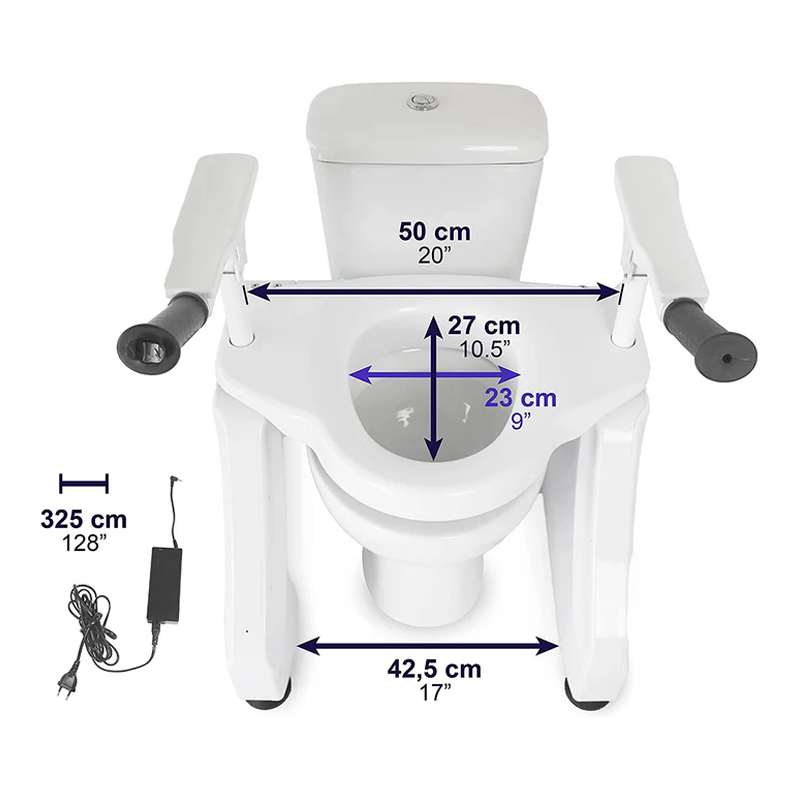 ELEVACIÓN ELÉCTRICA: La estructura de inodoro está diseñada para favorecer la independencia del usuario gracias a su sistema de elevación eléctrico que puede inclinarse hasta 30º, ayudándole a sentarse e incorporarse suavemente en el inodoro. Además, sus cómodos reposabrazos proporcionan un mayor apoyo y estabilidad, evitando así resbalones o caídas.