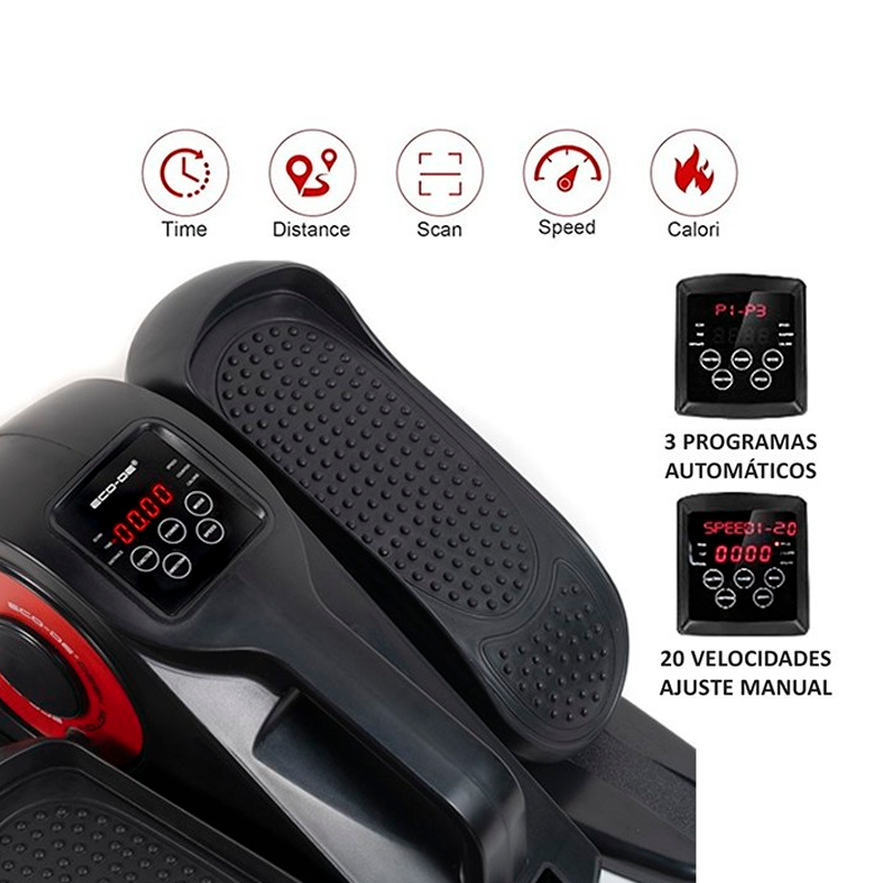 Función automática y manual (velocidad y dirección ajustables de los pedales) le permite ajustar el nivel de intensidad de su ejercicio. 20 niveles de Potencia Speed. Tiempo ajustable de 5 a 30 minutos.
