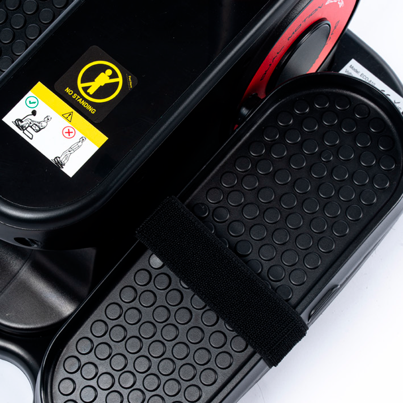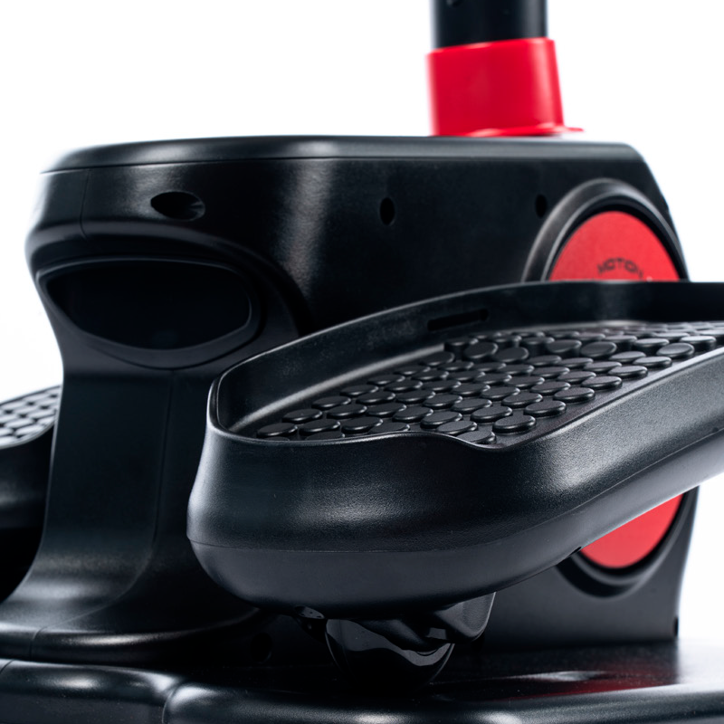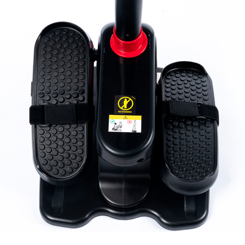 La parte superior cuenta con dos mangos antideslizantes para un agarre firme, mientras que la base incorpora pedales con textura rugosa y correas de sujeción que evitan deslizamientos. Incluye regulador de altura para mejorar la ergonomía y adaptarse a diferentes usuarios, garantizando seguridad y confort en cada uso.