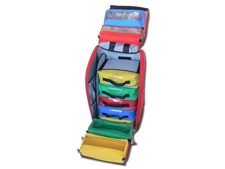 Mochila modular extragrande con 8 bolsillos interiores, 4 de color con asa (modelo E5) y 4 de color con ventana transparente (modelo E2).