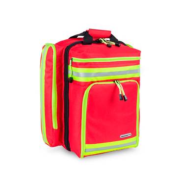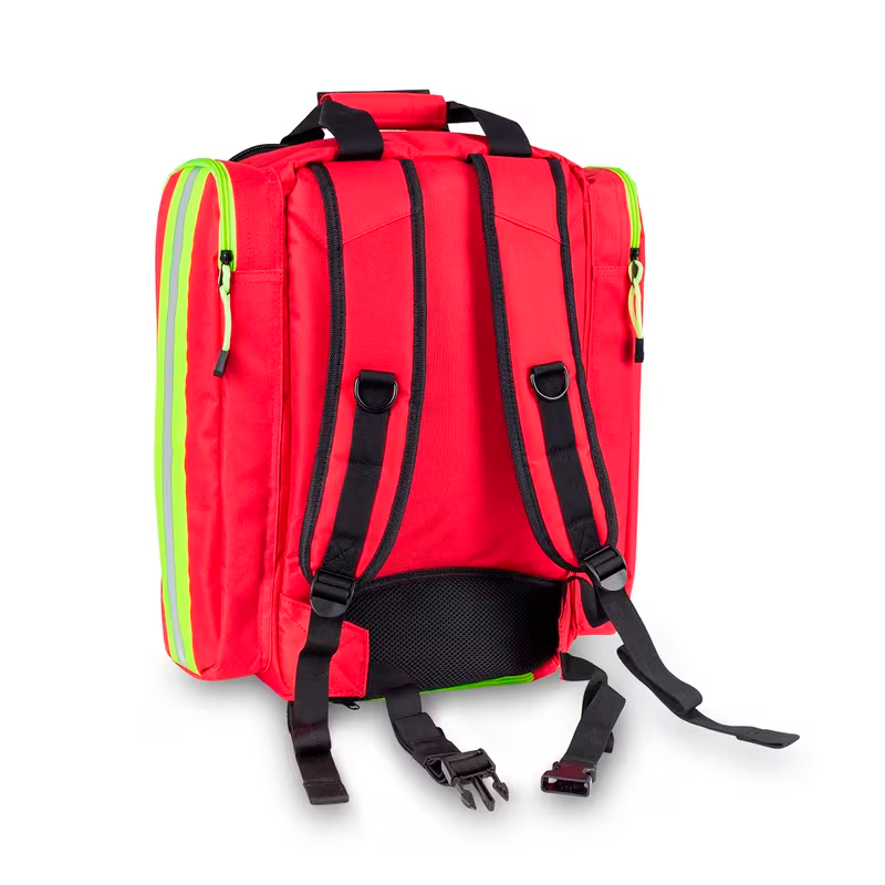 Mochila de primera intervención ideada para servicios preventivos (eventos deportivos, conciertos, etc.) Cuerpo principal con cremallera periférica (Amarillo Flúor para mejor localización de esta) para una apertura total. 2 lengüetas centrales y dos cuerpos laterales formados por quince bolsillos diseñados para facilitar la clasificación del material sanitario, fungible y toma de constantes (6 de rejilla y 9 de material transparente) y una zona con 9 bandas elásticas horizontales y 2 cintas de ajuste (mediante sistema de buckles) para clasificación de material fungible y mantas de lona enrollables.