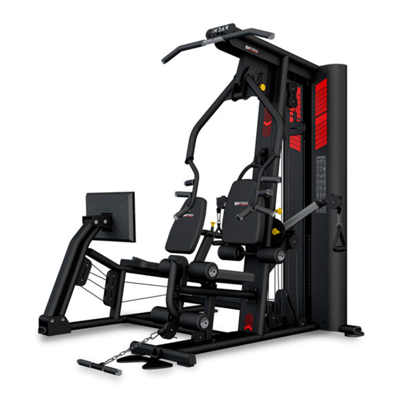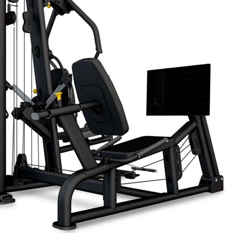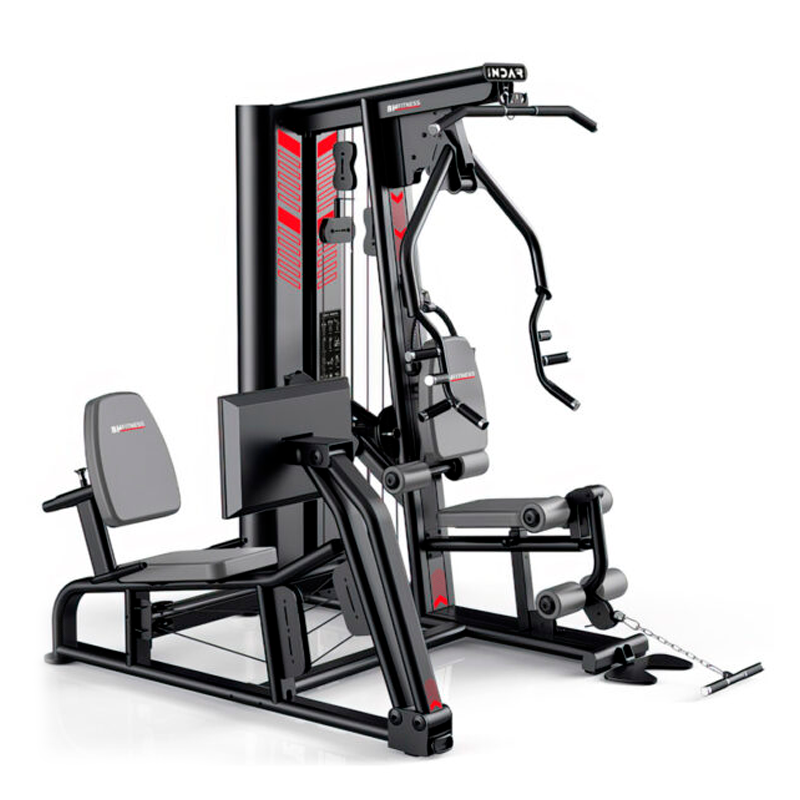 Su estructura robusta y sus múltiples accesorios permiten trabajar todos los grupos musculares con comodidad. Incluye prensa de piernas y un sistema de carga profesional de 90 kg para un entrenamiento de alto nivel.