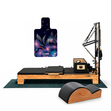 En el centro del pack se encuentra el Reformer con Torre Elite, una máquina de alto rendimiento que combina la precisión del reformer clásico con la funcionalidad ampliada de una torre equipada con poleas y múltiples posiciones de ajuste. Su estructura en madera maciza, tapizado de alta densidad y sistema de deslizamiento suave permiten una experiencia de entrenamiento fluida y estable, adaptable a diferentes niveles y tipos de ejercicio, desde fuerza y control postural hasta movilidad y estiramientos.