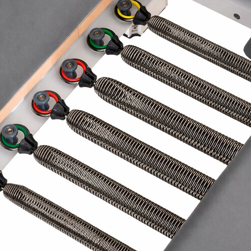 - ACCESORIOS REFORMER: Dos muelles rojo (fuertes), 2 muelles verdes (medios) y 2 muelles amarillo (ligero)Un set de asas dobles confortables para uso de manos y pies