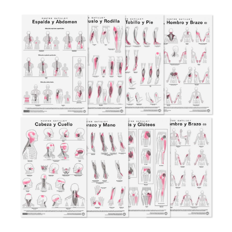 Set de 8 Láminas de Puntos Gatillo diseñado para profesionales de la fisioterapia y rehabilitación.