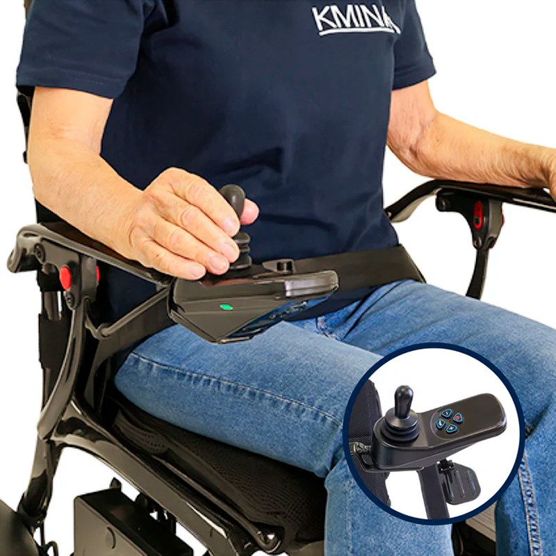 La silla de ruedas eléctrica integra freno electromagnético: al soltar el joystick se detiene al instante, evitando movimientos en pendientes y aportando seguridad sin esfuerzo.