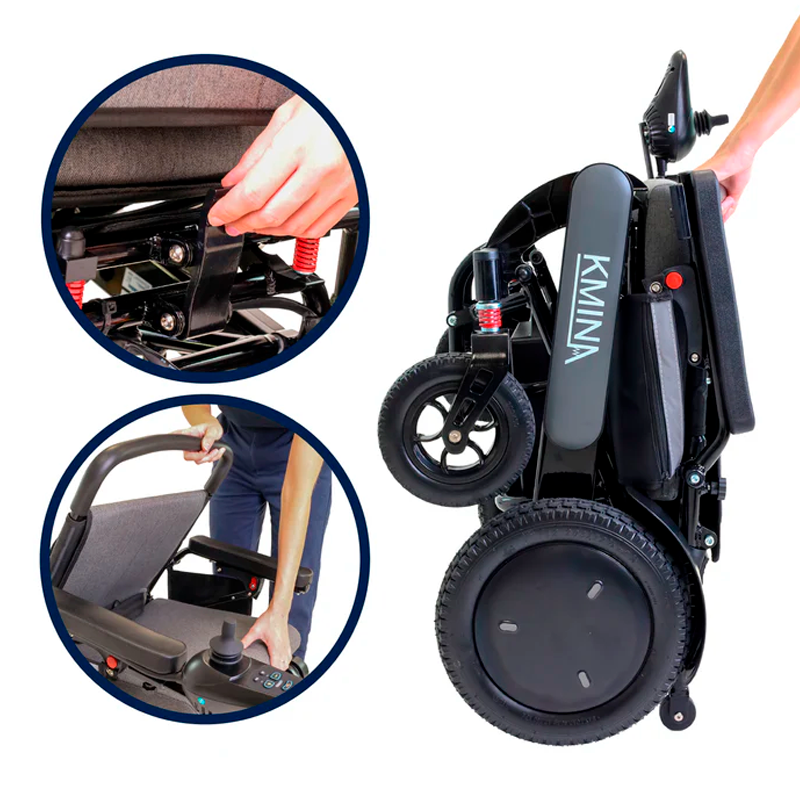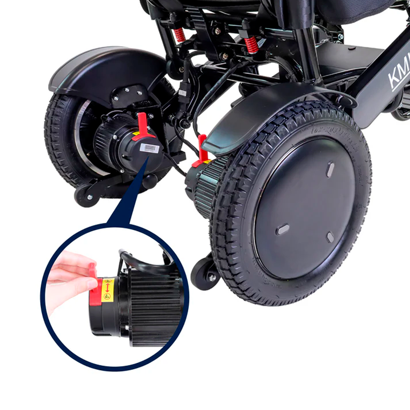 SEGURIDAD Y ESTABILIDAD: Equipada con frenos electromagnéticos y ruedas traseras neumáticas de 31 cm de diámetro que permiten mayor estabilidad y mejor desempeño en terrenos irregulares o caminos de tierra. Cuenta con un sistema de frenado automático seguro y con opción de conducción manual para mover la silla de ruedas eléctrica sin esfuerzo cuando está apagada o en espacios reducidos.