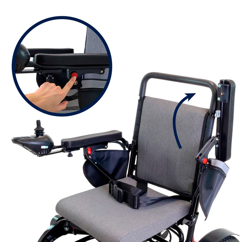 La silla de ruedas eléctrica integra freno electromagnético: al soltar el joystick se detiene al instante, evitando movimientos en pendientes y aportando seguridad sin esfuerzo.
